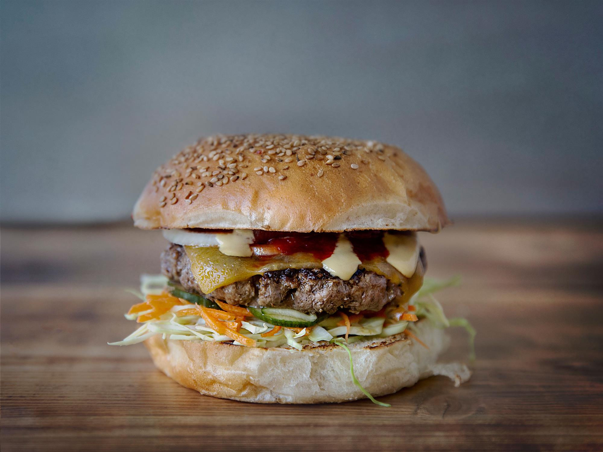Mayonnaise - grønt - pickles - bøf - ost - løg - ketchup - dijonnaise