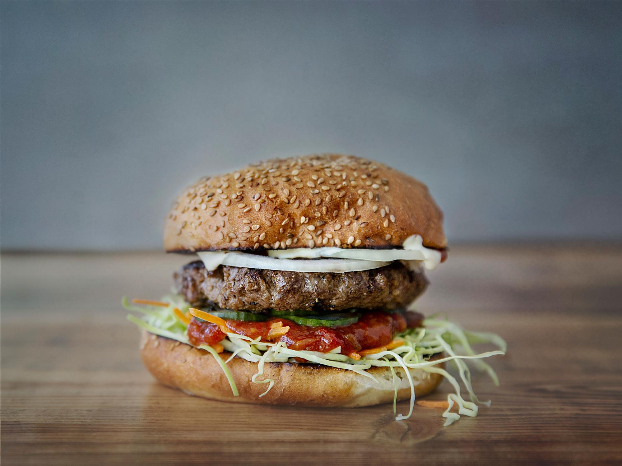 Mayonnaise - grønt - habanero-relish - pickles - bøf - løg - syltede rødløg - purløgsdressing - hotsauce